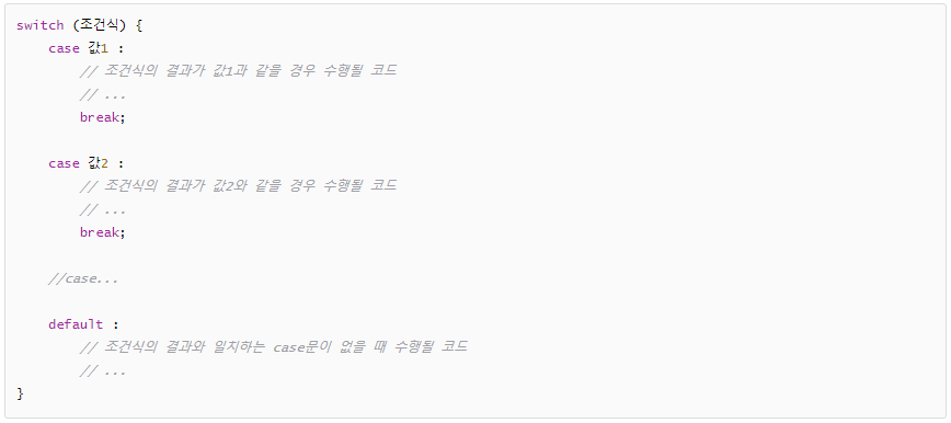 * switch 문은 조건식을 먼저 계산한 다음, 그 결과와 일치하는 case 문으로 이동한다.