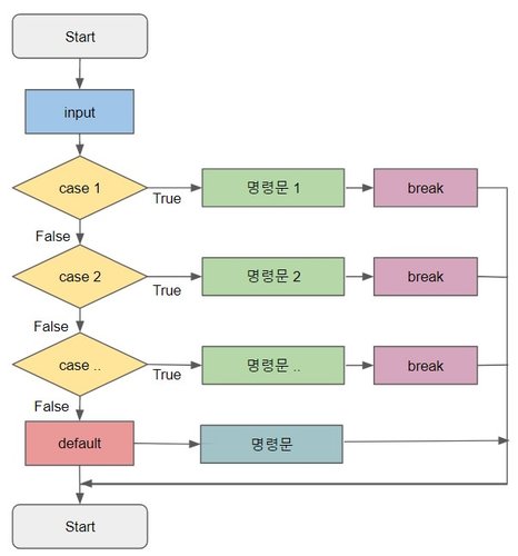 - switch 문에서 사용하는 키워드는 switch, case, default, break 이다.