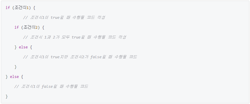 -if 문의 블럭 { } 내에서 또 다른 if 문을 포함시키는 코드를 중첩 if 문이라고 한다. ( 횟수 제한 X )