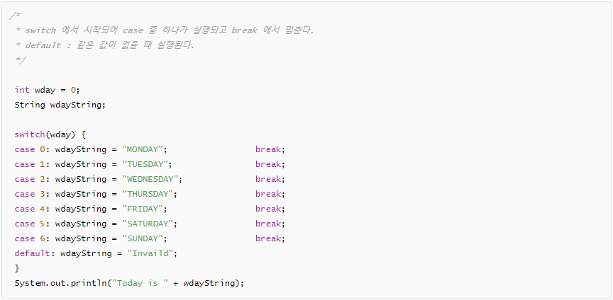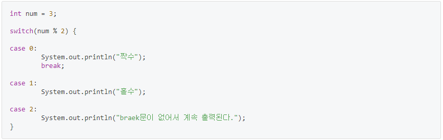 → 이동한 case문 아래에 있는 코드를 수행하고 break문을 만나면 전체 switch문을 빠져나간다.