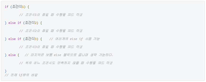 만약 결과가 참(true)인 조건식이 없었다면 마지막 else문의 블럭을 수행하게 된다.