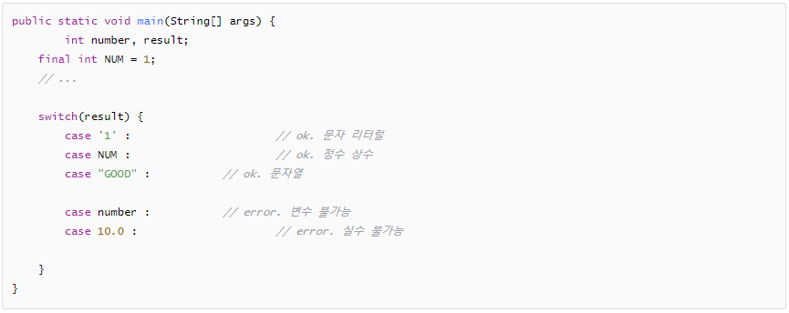 2. case문의 값은 정수 상수(문자 포함), 문자열만 가능하며, 중복되지 않아야 한다.
