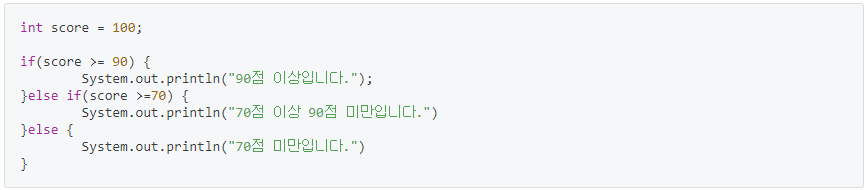 또한 해당하는 조건식이 나오면 그 블럭 { }안의 코드들만을 수행하고 전체 if문의 바깥으로 빠져나온다.