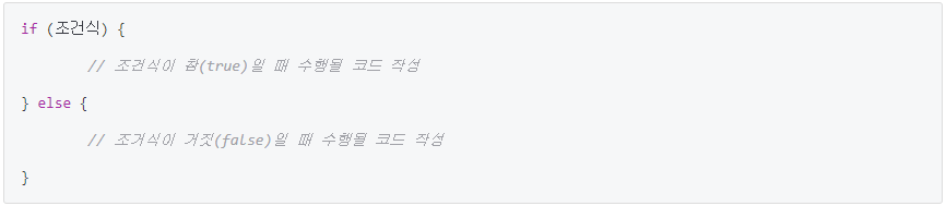 참일 때 수행할 내용을 if 블럭 { }에, 거짓일 때 수행할 내용을 else 블럭 { }에 작성한다.