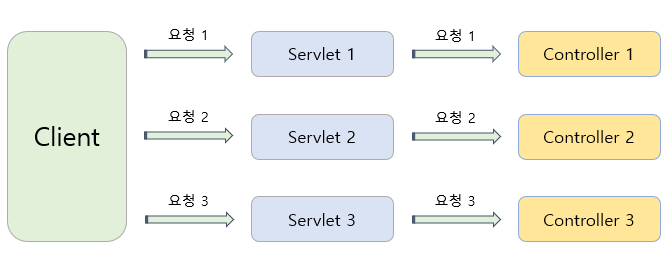 기존의 방식은 요청 url당 servlet을 생성하고 해당 Controller에게 요청을 보내는 코드를 따로 작성해야 했습니다.