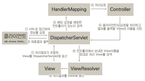 위에서 Servlet 대신 Dispatcher Servlet이라는 Servlet이 사용자의 모든 요청을 받아 여러 작업을 거친 뒤 Controller에게 역할을 위임합니다.