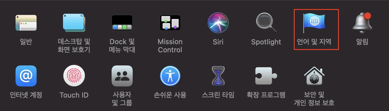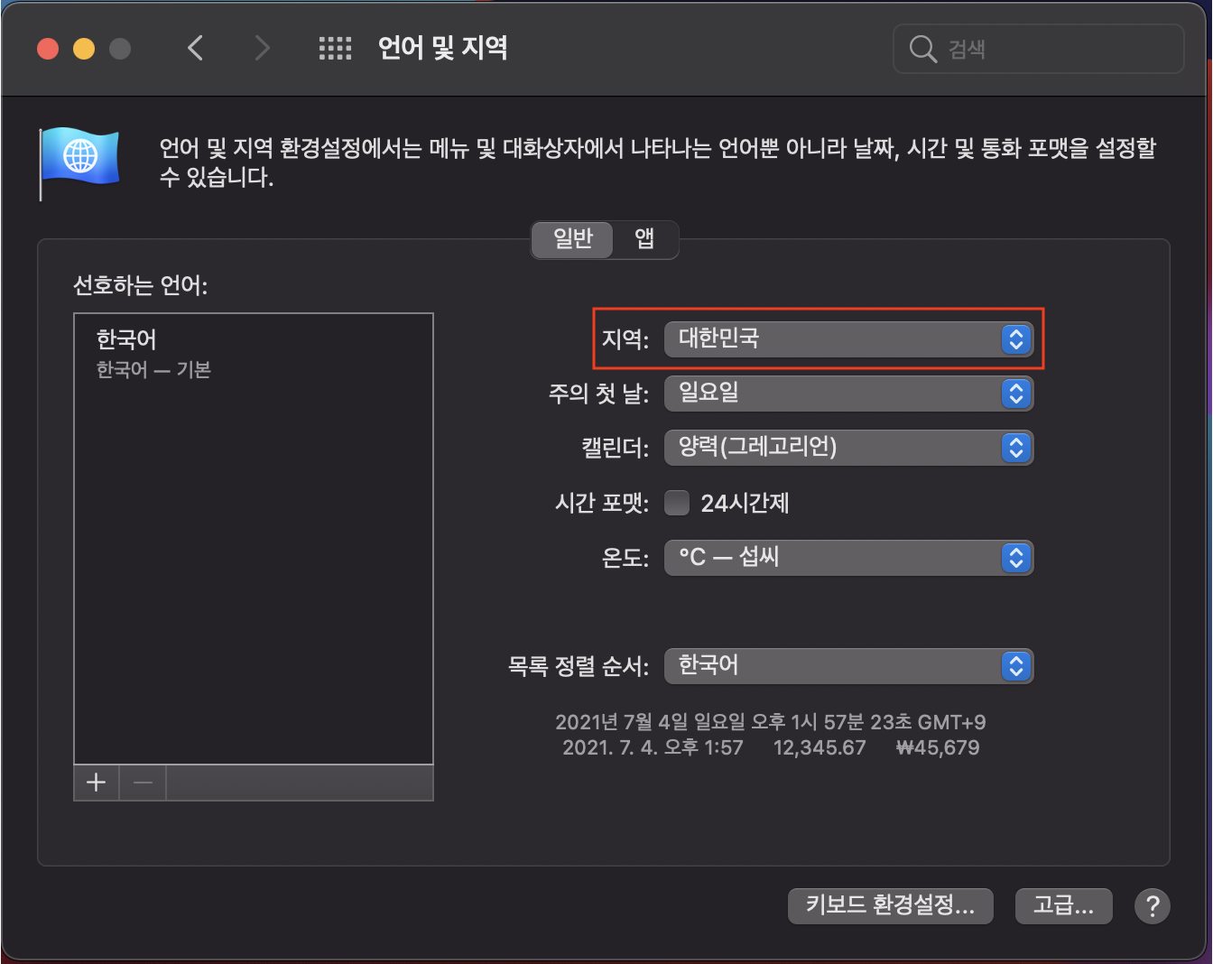 첫번째는 Mac > 시스템 환경설정 > 언어 및 지역 메뉴에서 지역을 대한민국이 아닌 다른 곳으로 변경했다가 다시 대한민국으로 세팅해 주는 방법입니다.