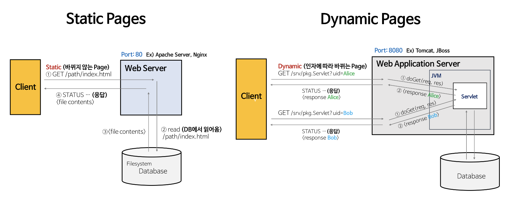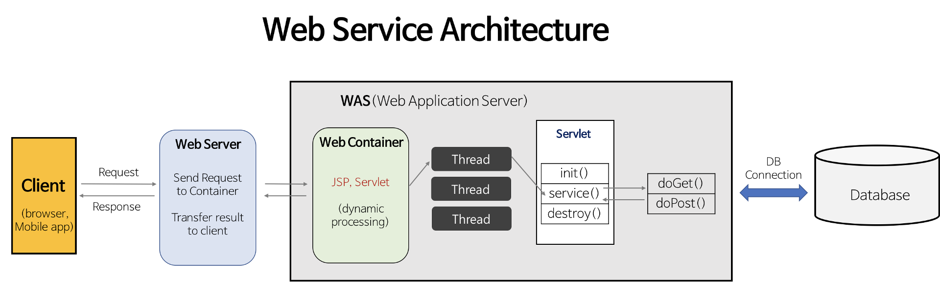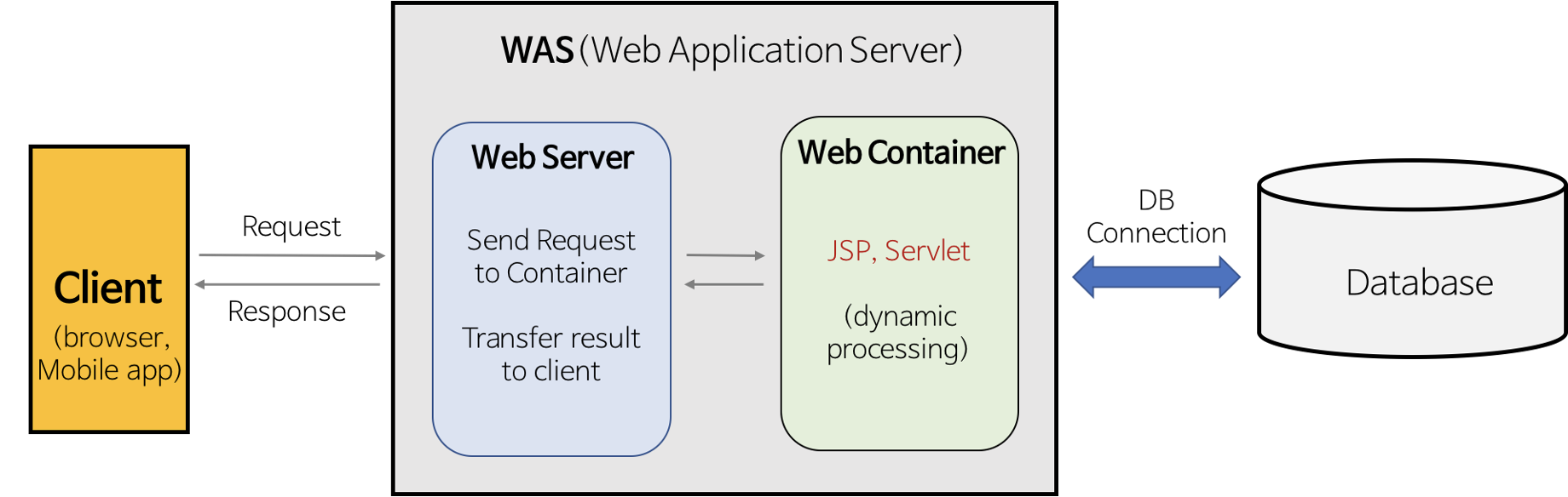 덕분에 사용자의 다양한 요구에 대해 웹 서비스를 제공할 수 있으며, WAS는 jsp, Servlet 구동환경을 제공해주기 때문에 "웹 컨테이너(Web Container)" or "서블릿 컨테이너(Servlet Container)"라고도 불린다.