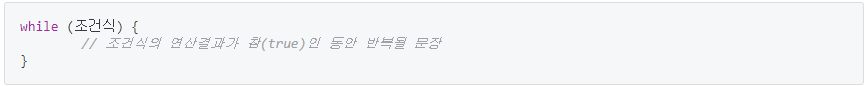- for문이 정해진 횟수만큼 반복한다면, while문은 조건식이 true일 경우에 계속해서 반복합니다.