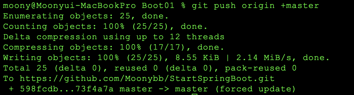 해결 방법은 push하려고하는 브랜치 이름 앞에 + 를 붙여 push 하면 된다.