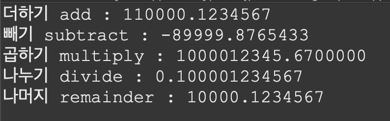 그래서 BigDecimal연산을 할 때에는 아래와 같이 BigDecimal 메서드를 사용한다.