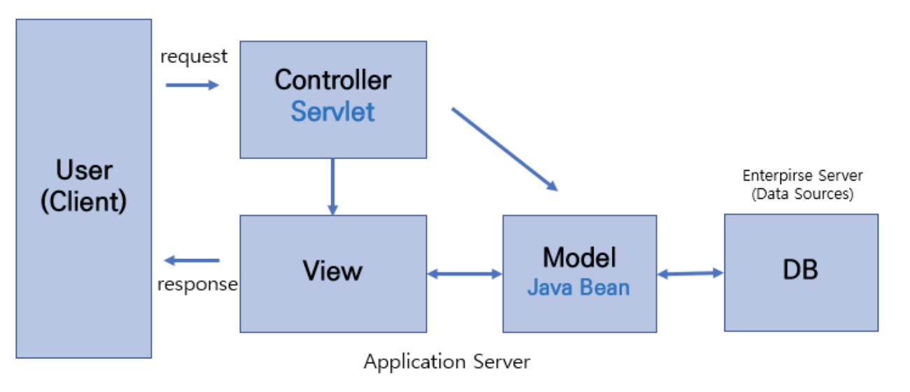 기존에 View와 Controller의 역할을 모두 수행하던 Jsp는 뷰의 역할만 하게 되고, 대산 Controller의 역할을 Servlet(서블릿)이 수행한다.