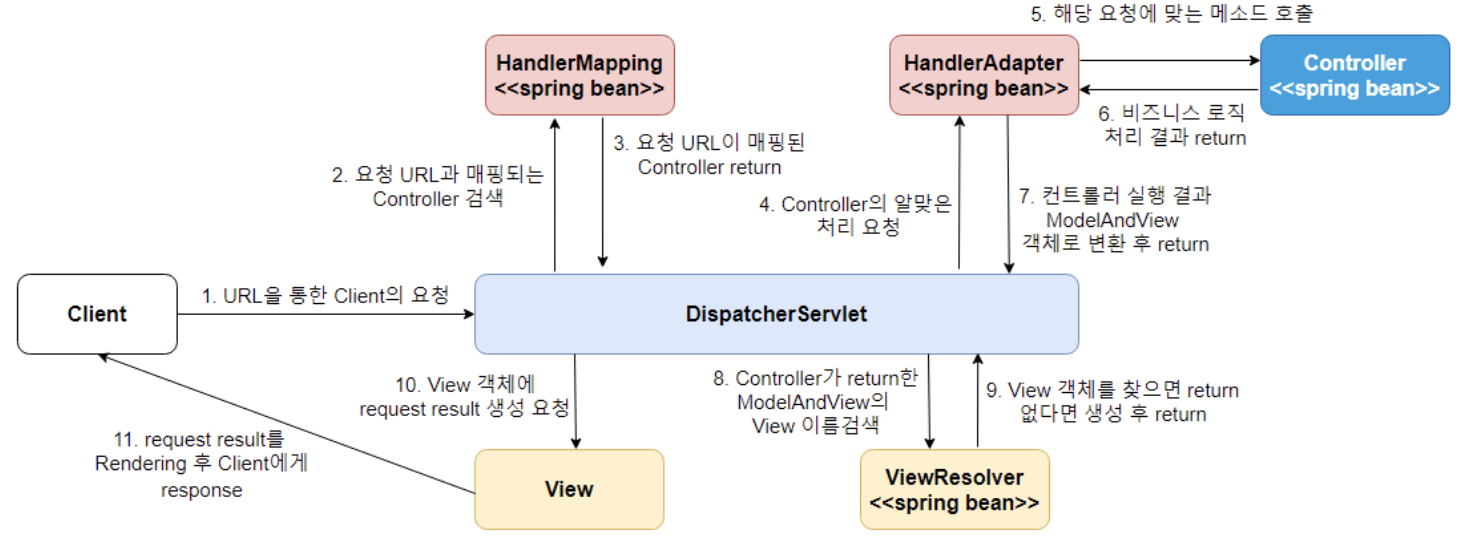 | DispatcherServlet | 클라이언트의 요청을 전달받아 요청에 맞는 컨트롤러가 리턴한 결과값을 View에 전달 |