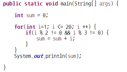 2의 배수와 3의배수가 둘 다 아닌 수가 참이기 때문에 &&(AND)를 사용한다. → i % 2 != 0 && i % 3 != 0