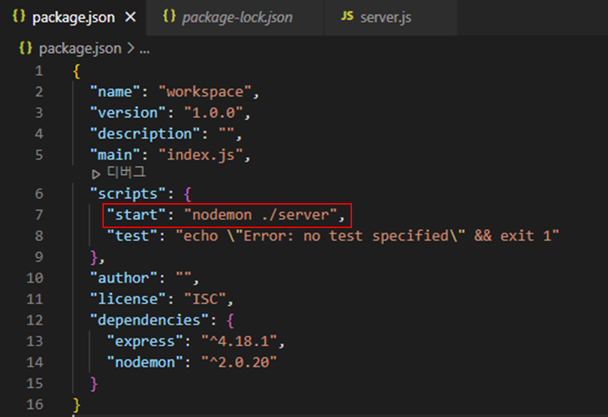 위처럼 package.json 파일에 dependencies에 express버전이 추가됐으면 성공