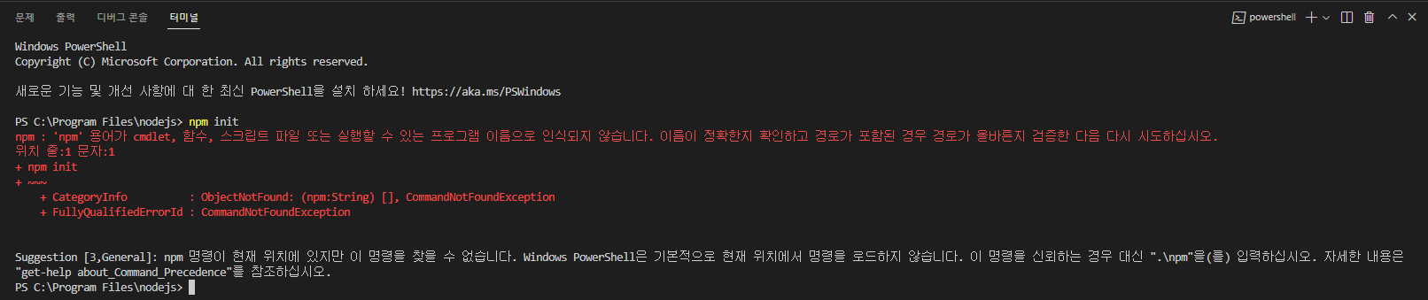 * 아래와 같이 오류가 발생한다면 터미널의 설정이 powershell로 되어있는 경우임