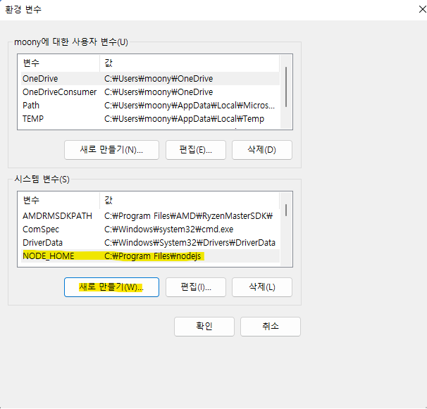 위에서 default로 설치했다면 위치는 C:\Program Files\nodejs 이다. 시스템 변수에 NODE_HOME의 변수명으로 등록한다.