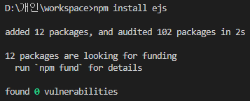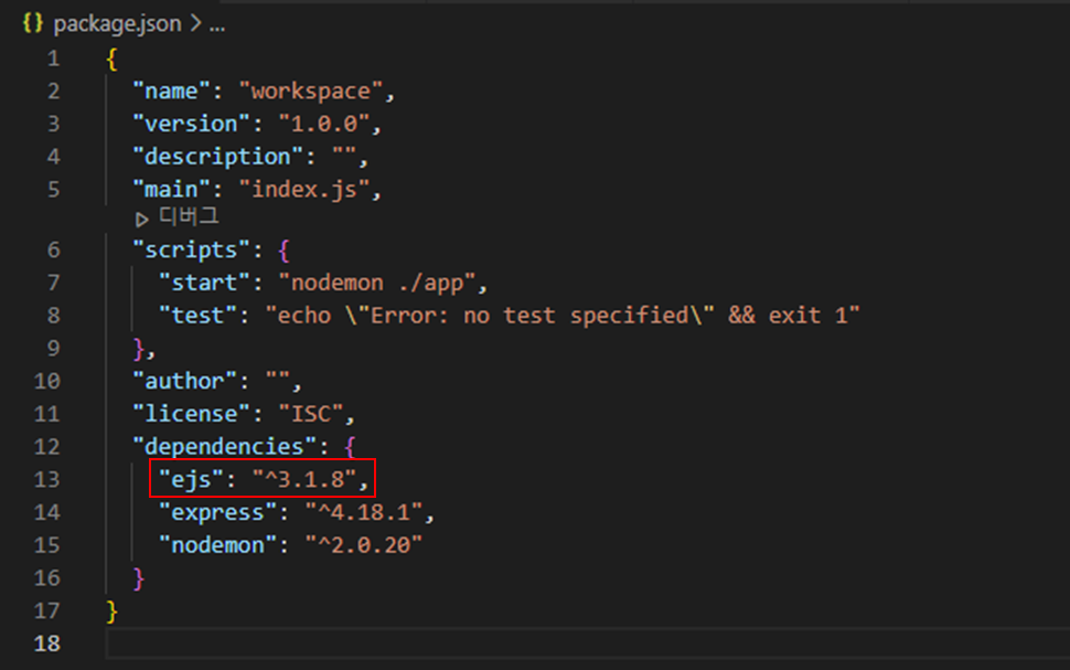 1번처럼 ejs 템플릿을 설치하면 자동으로 package.json파일에 디펜던시가 추가될 것이다. 혹시라도 추가가 되지 않은 경우에는 추가해주도록 하자.