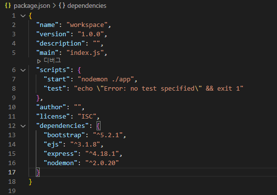 설치가 완료되면 package.json의 디펜던시에 bootstrap이 추가된다.