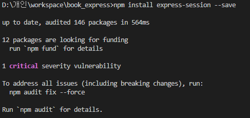 아래 명령어를 터미널에 입력해 express-session 모듈을 사용할 준비를 해준다.