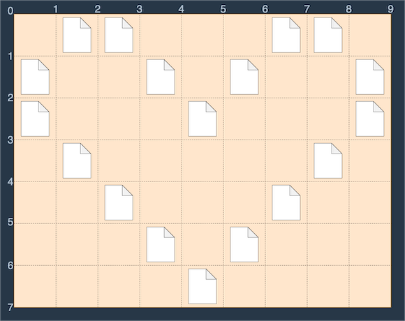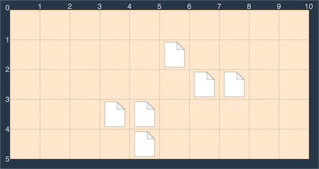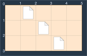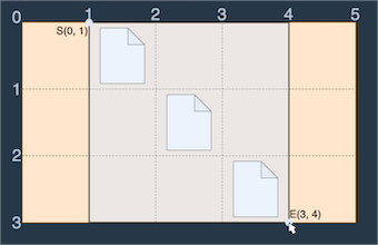 이러한 바탕화면에서 다음 그림과 같이 S(0, 1)에서 E(3, 4)로 드래그하면 세 개의 파일이 모두 선택되므로 드래그 한 거리 (3 - 0) + (4 - 1) = 6을 최솟값으로 모든 파일을 선택 가능합니다.