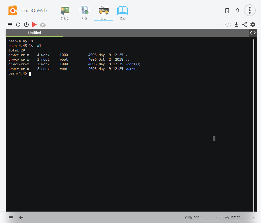로그인 후 실습 탭 - 언어 shell로 변경 하면 아래와 같이 간단하게 리눅스를 체험할 수 있다.