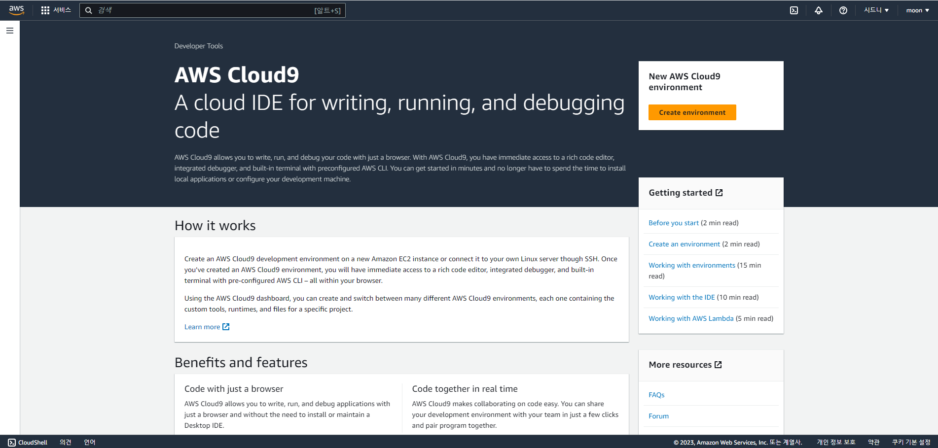 AWS Cloud9은 브라우저만으로 코드를 작성, 실행 및 디버깅할 수 있는 클라우드 기반 IDE(통합 개발 환경)입니다. 코드 편집기, 디버거 및 터미널이 포함되어 있습니다. Cloud9은 JavaScript, Python, PHP를