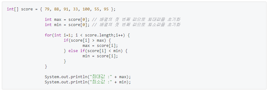 배열의 첫번째 요소 score[0]의 값으로 최대값 변수 max와 최소값 변수 min을 초기화 한다.