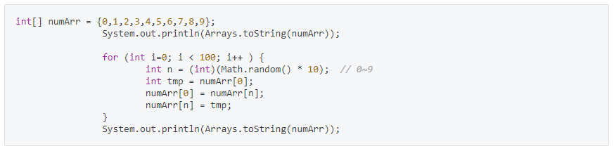→ 2번 작업을 for문을 통해 서로 값을 바꾸는 작업이 100번 반복되어 0 ~ 9 범위의 10가지 숫자가 섞인다.