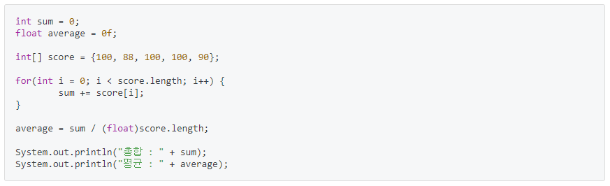 average의 변수 타입은 float이므로 sum이나 score.length에 형 변환을 해주어야 한다.
