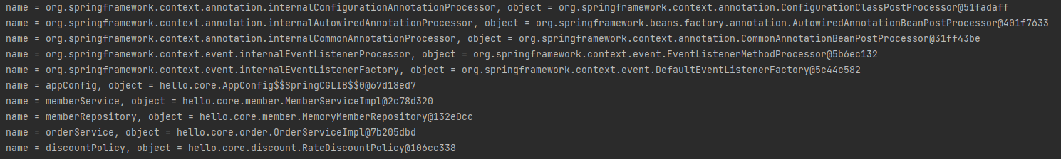 위 처럼 작성하게되면 스프링 내부적으로 관리하고 있는 Bean을 제외한 직접 애플리케이션에서 설정한 Bean의 목록을 조회할 수 있다.