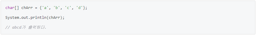 + 예외적으로 char 배열은 println 메서드로 출력하면 각 요소가 구분자 없이 그대로 출력된다.