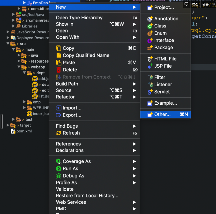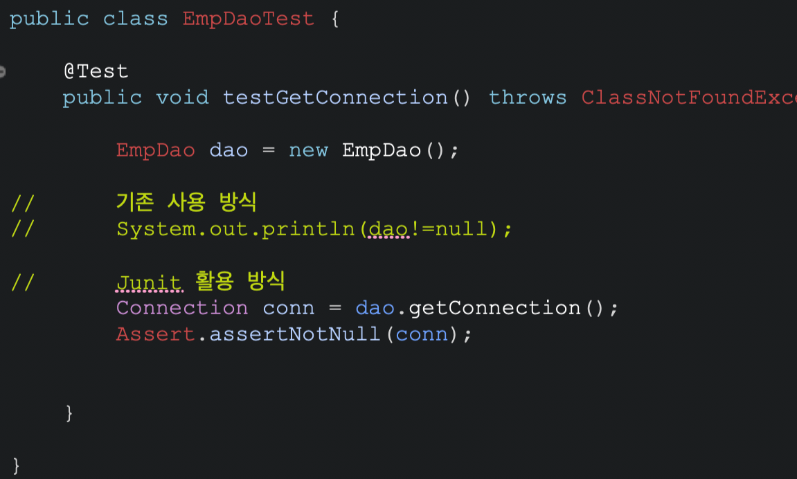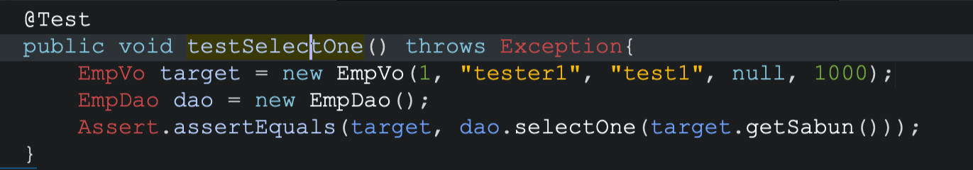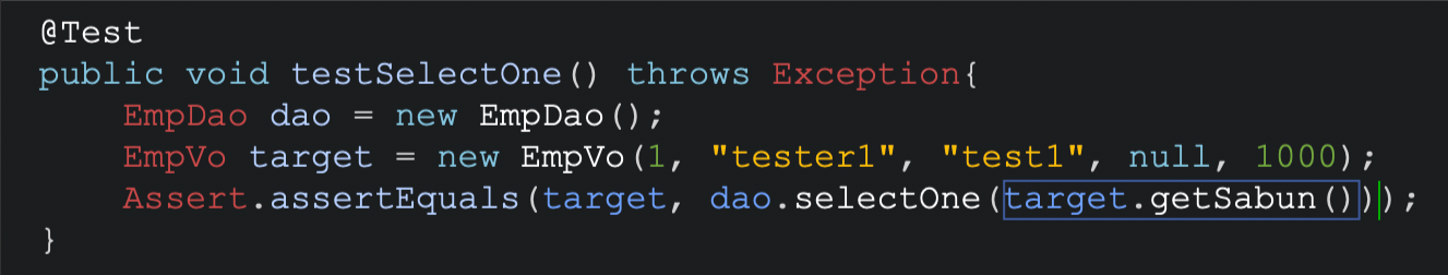 타겟에 테스트 할 것을 담아놓고 메서드 호출하여 타겟의 사번 값을 들고 가 서로 비교를 하여 equals true가 나오면 테스트 true