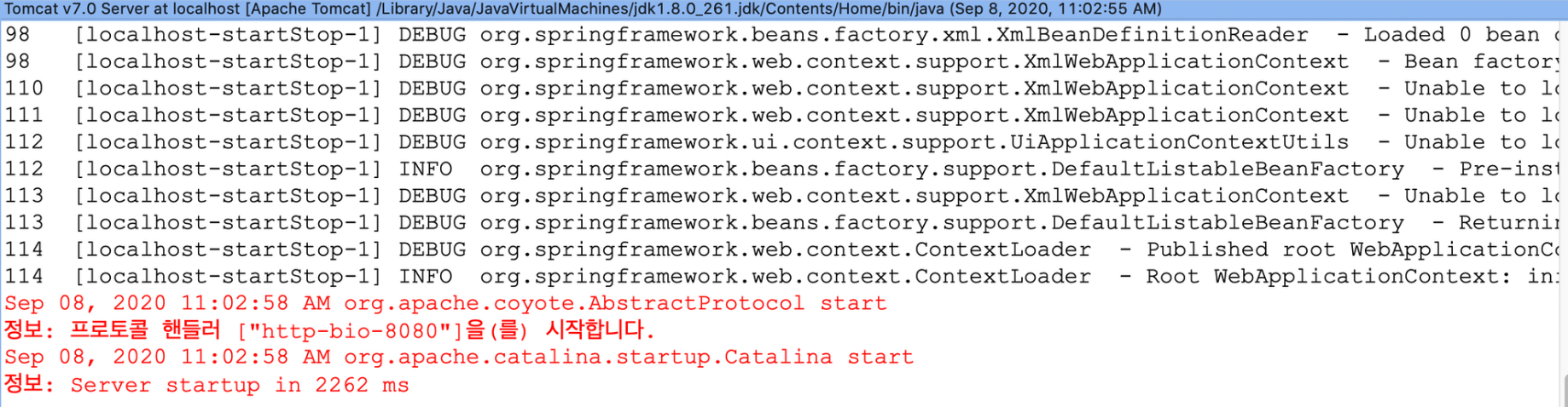 그럼 기존과 다르게 logging 메시지가 출력된다. 그리고 지금의 출력 레벨은 debug이다.