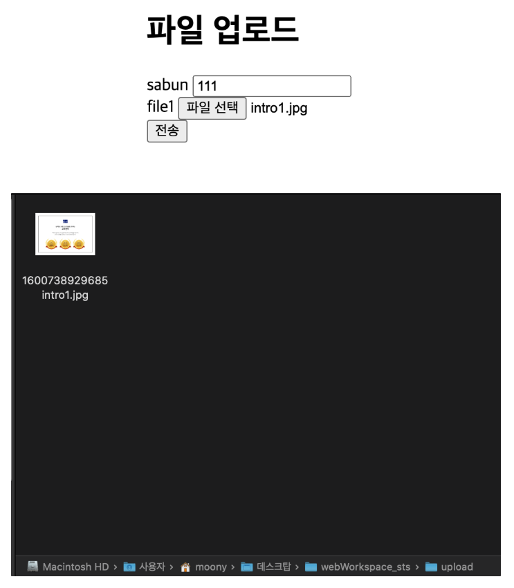 아래처럼 파일을 전송하게 되면 설정한 해당 디렉토리에 파일이 업로드 된다.