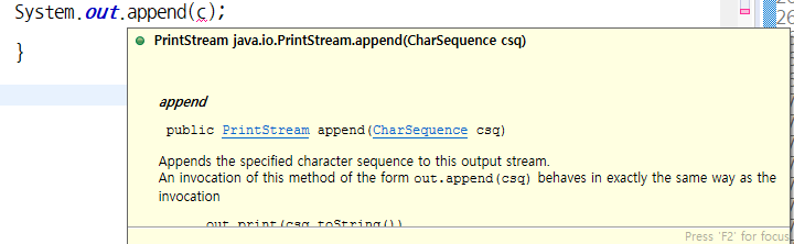 위처럼 append 메서드 위에 커서를 두면 노란색 창이 뜨는데 앞쪽에 PrintStream이라고 하는 것이 반환타입인 것이다.