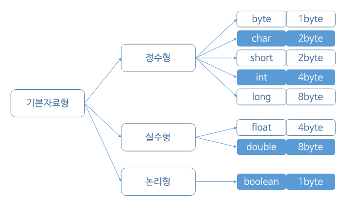 - 정수형 byte, short, int, long : 크기마다 표현할 수 있는 값의 범위가 다름