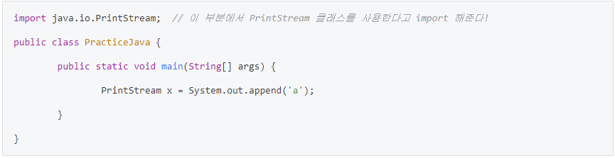 import java.io.PrintStram; 을 해주면 java안에 io안에 PrintStream이라는 클래스를 사용하겠다는 명령어이다.
