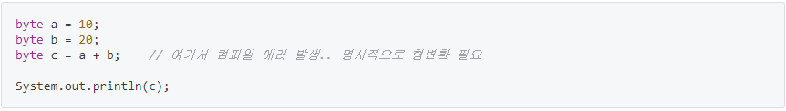 ' byte c = a + b; ' → ' byte c = (byte)(a + b); ' 로 변경하면 컴파일 에러가 발생하지 않는다.