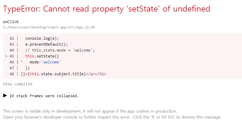 아래와 같이 바인딩을 해주지 않으면 this의 state를 바꾸기 위해 this.setState를 하는데 undefined 오류가 발생합니다.