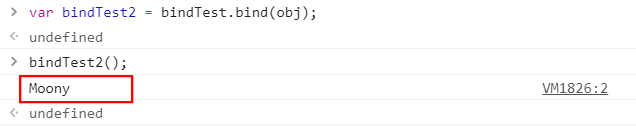 바인딩 이후 bindTest2(); 호출 시 해당 함수의 this는 obj를 가리키도록 설정하였기 때문에 this.name의 값을 가져와서 'Moony'의 값이 console.log에 찍힌 것을 볼 수 있습니다.
