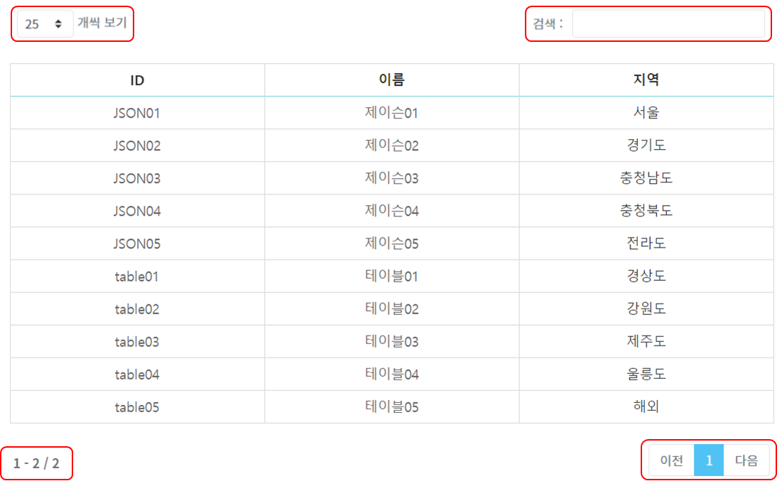 DataTables는 기본적으로 표시 건수, 검색, 정렬, 정보 표시, 페이징 기능이 추가되어 표출됩니다.